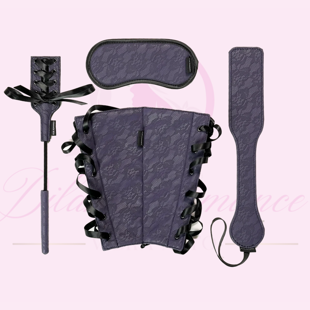 Adéntrate en el mundo del fetiche con un lujoso conjunto de cuatro piezas que incluye una venda para los ojos, una pala, una fusta y ataduras para los brazos. La pala y la fusta permiten experimentar el placer de forma dolorosa hasta dominarla, la venda para los ojos impide ver para centrar la sensación y las ataduras para los brazos atan para una sumisión sensual. Los detalles de satén y el material de felpa con estampado de encaje añaden un toque de suavidad para contrastar con la intensidad audaz del juego BDSM.